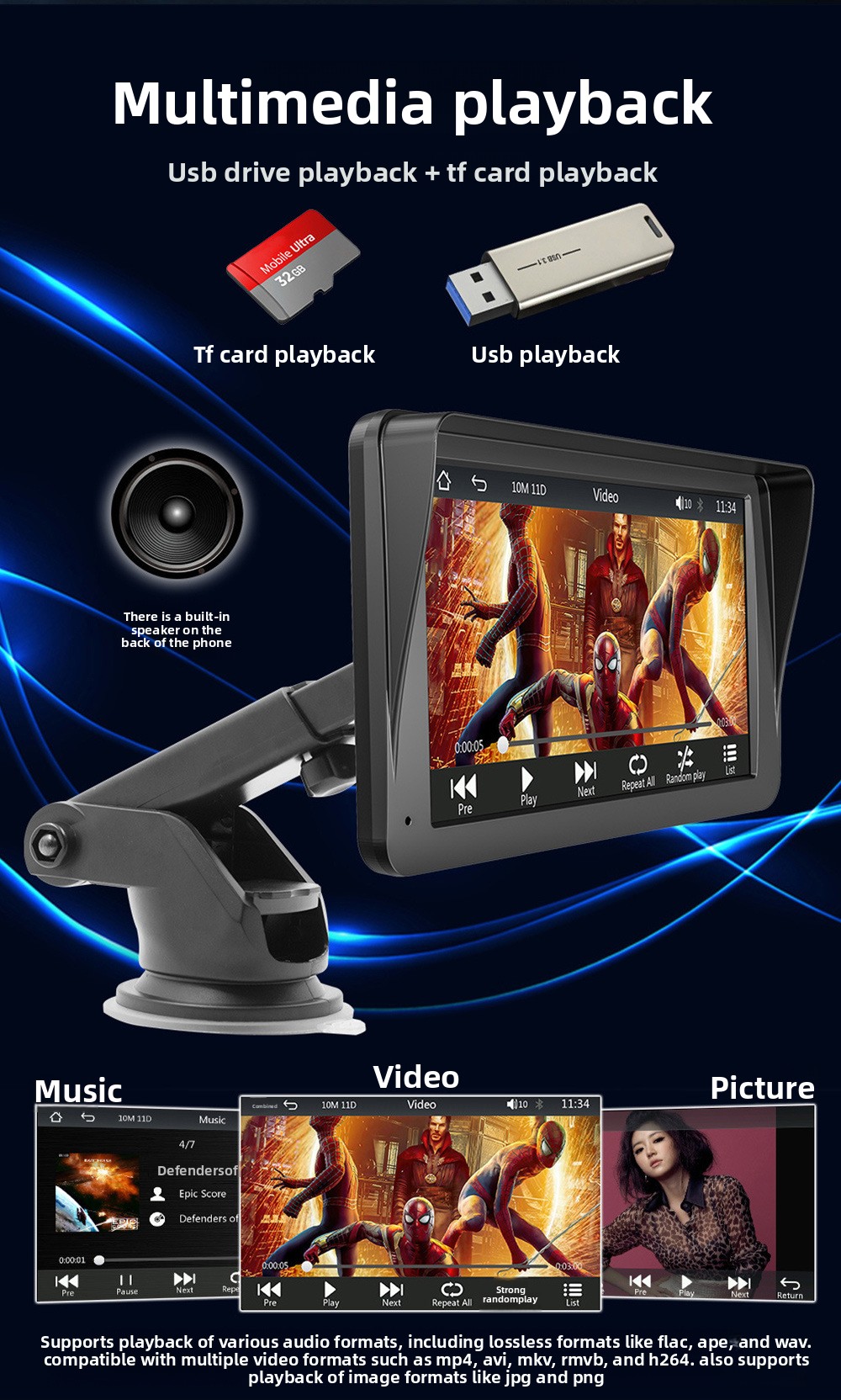 Multimedia Support: Reads U and TF cards for versatile media playback.