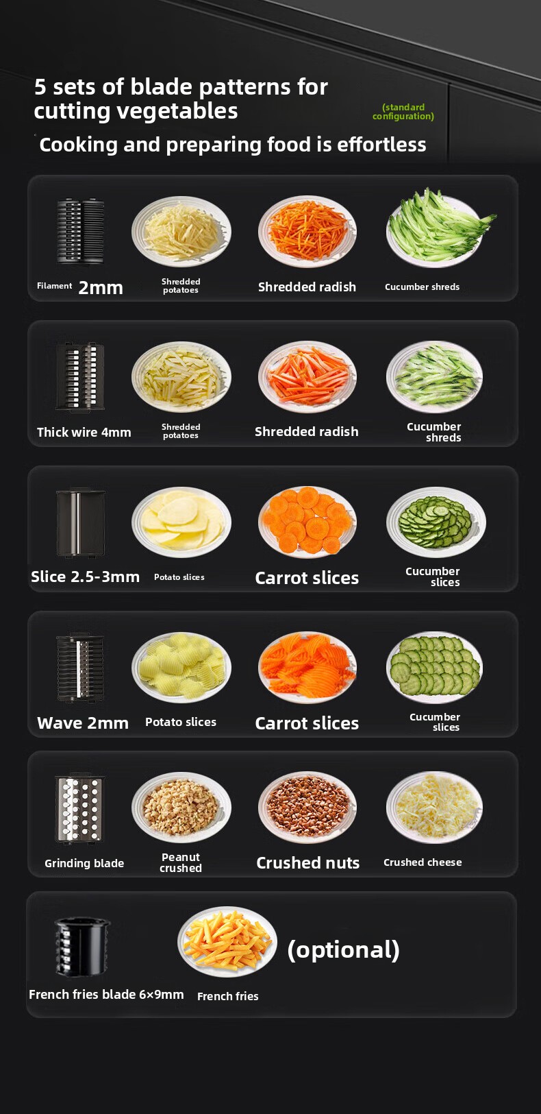 Multifunctional Blades: Includes 5 sets of knives for slicing, shredding, and grating.