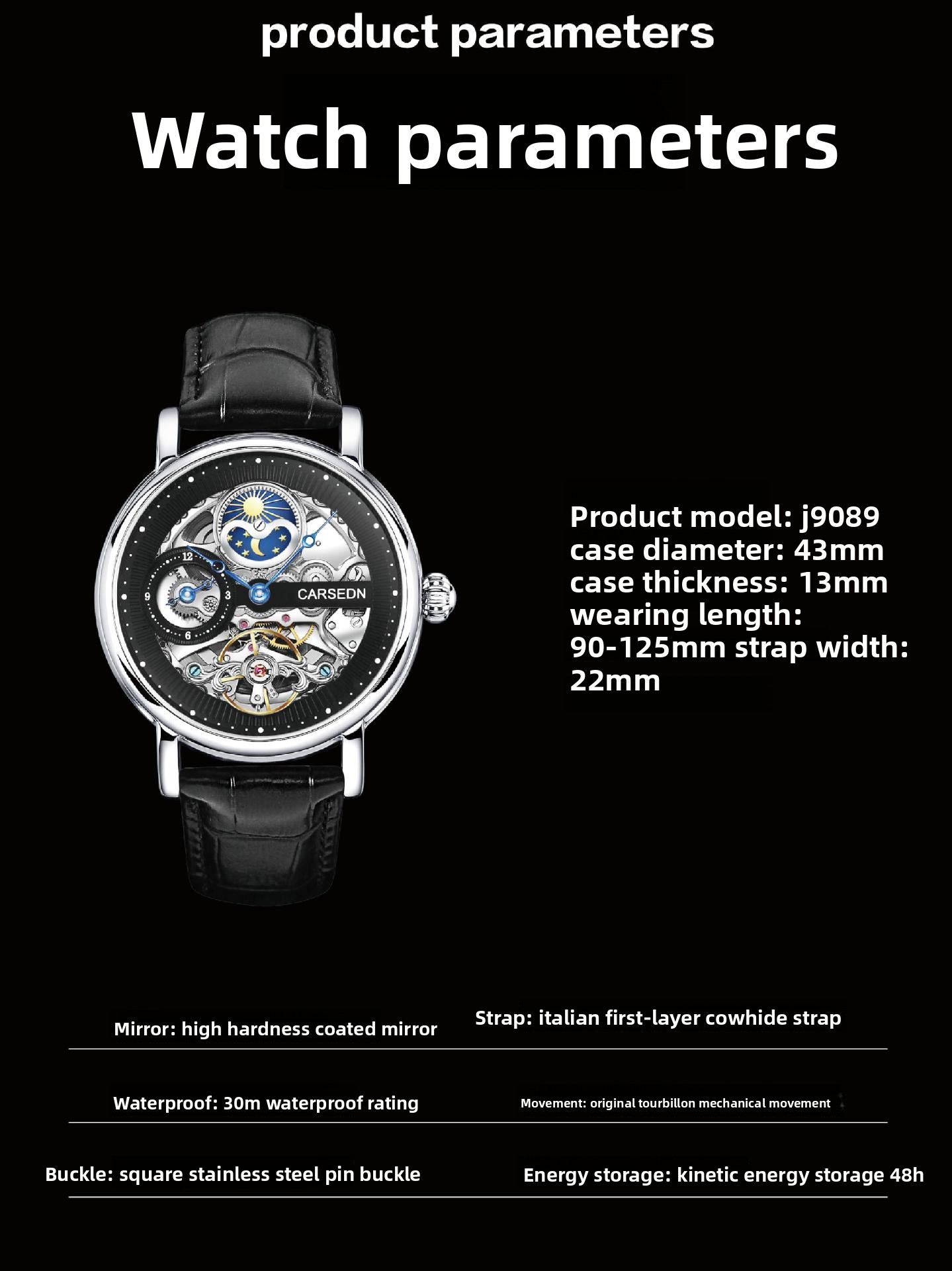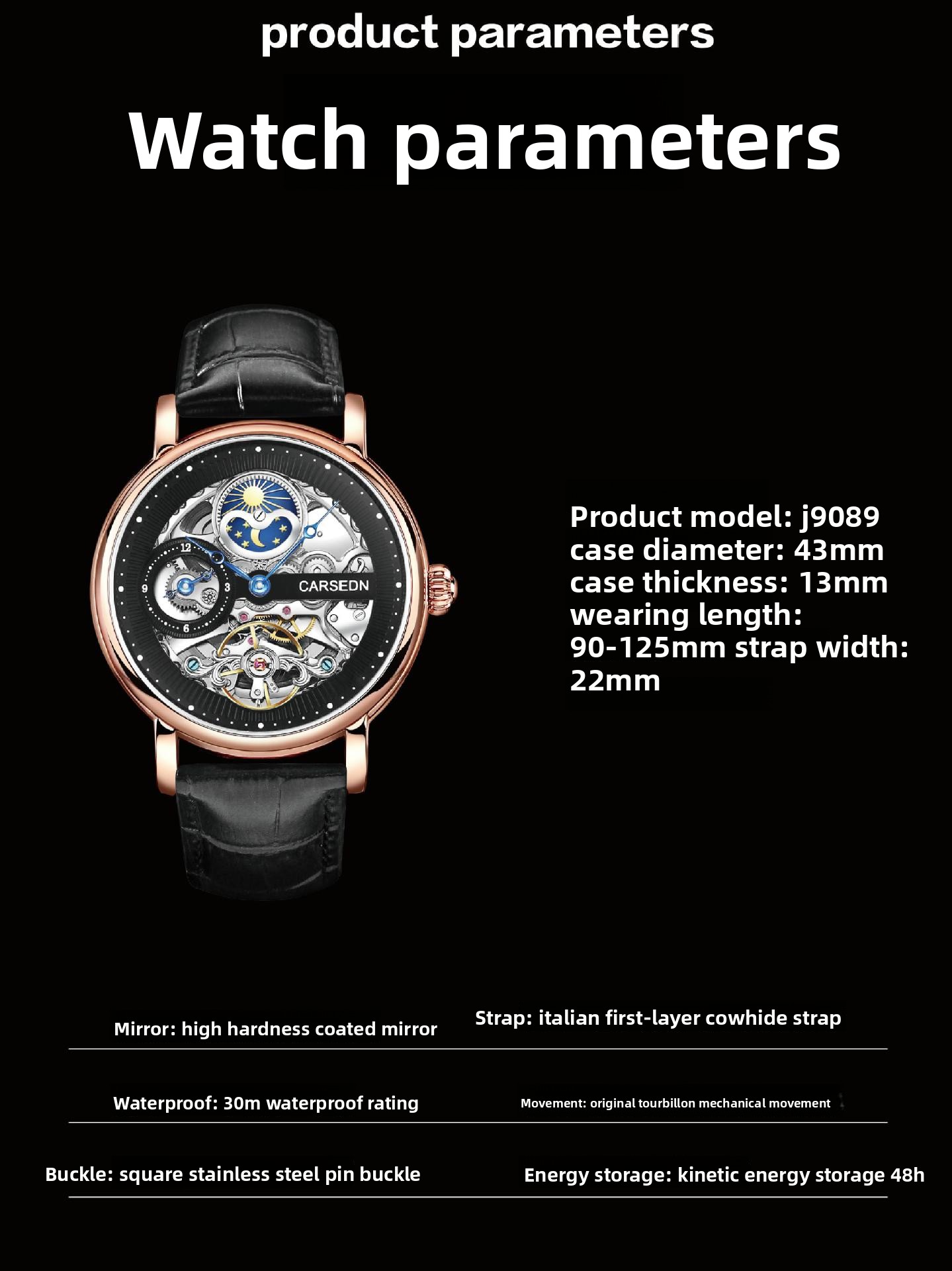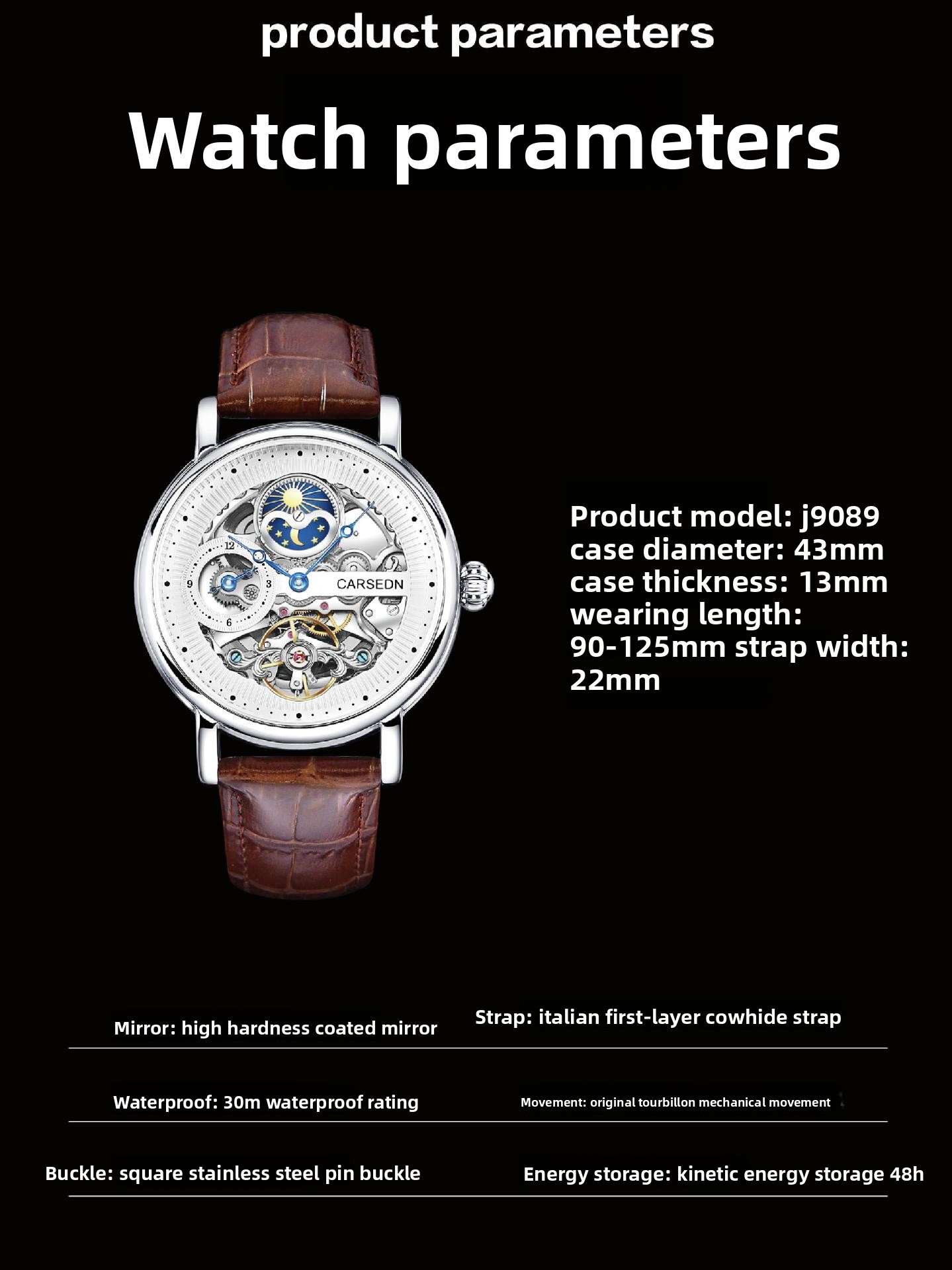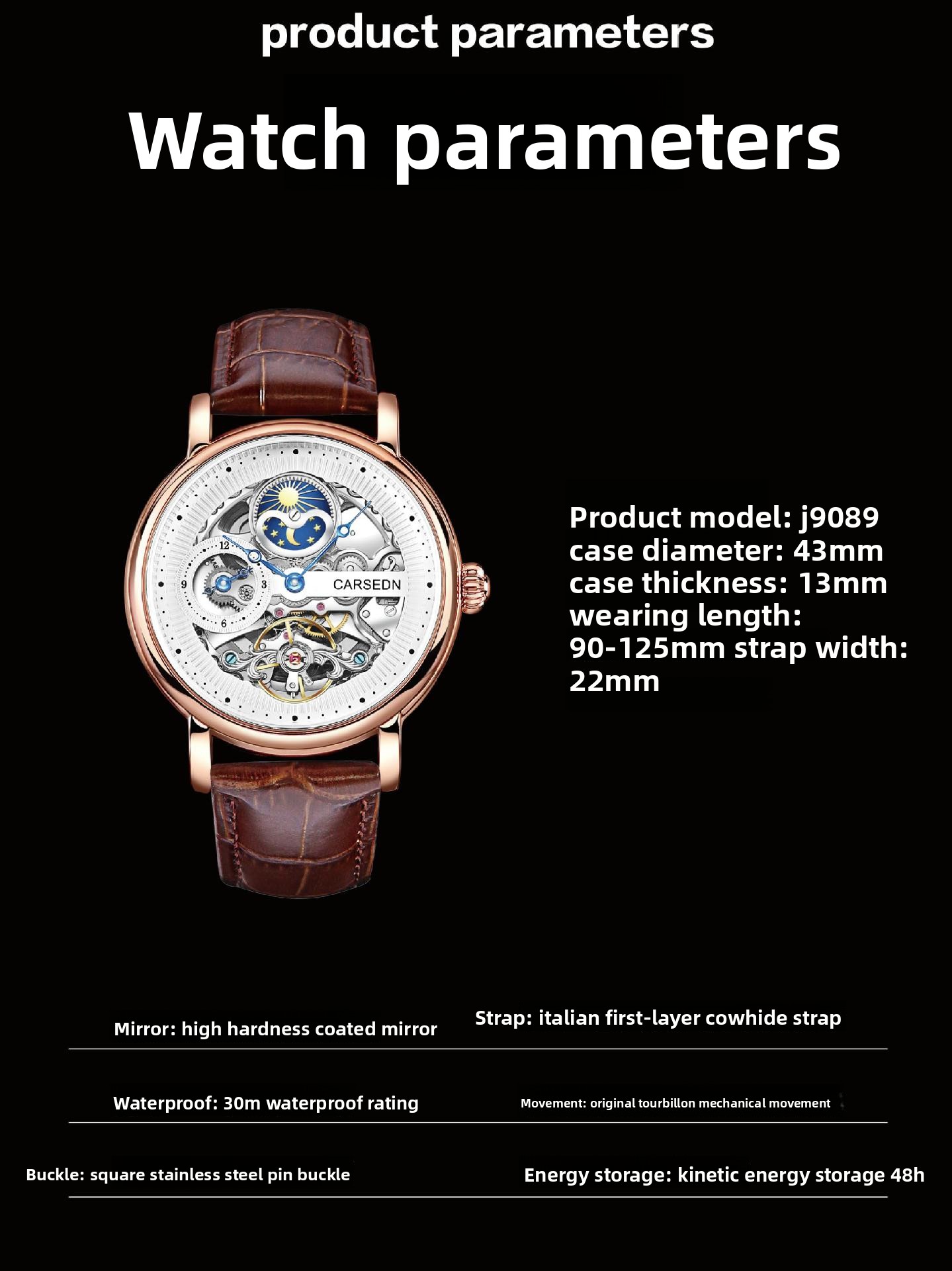 Luxury Materials: Stainless steel case with genuine leather strap and mineral-reinforced glass.