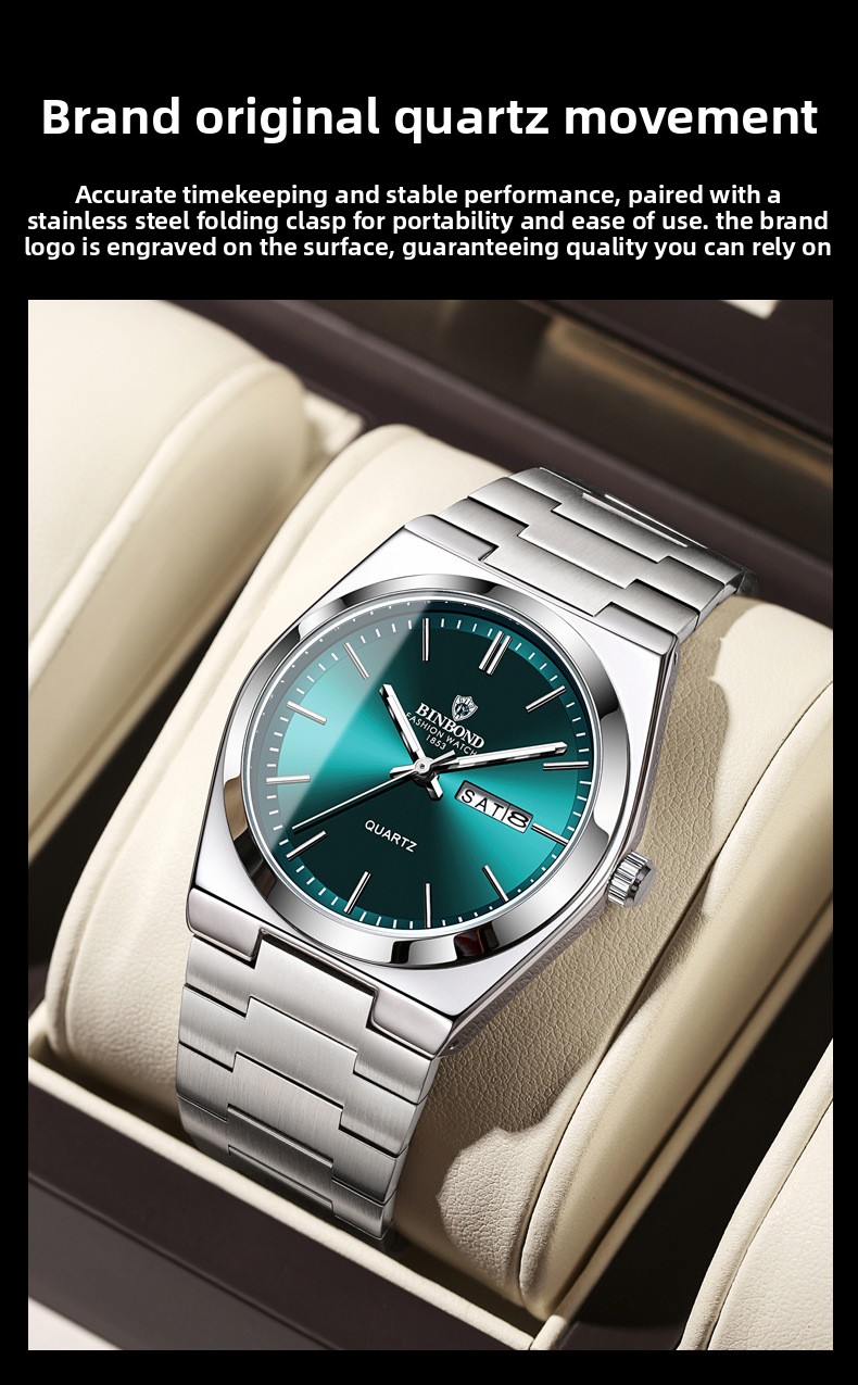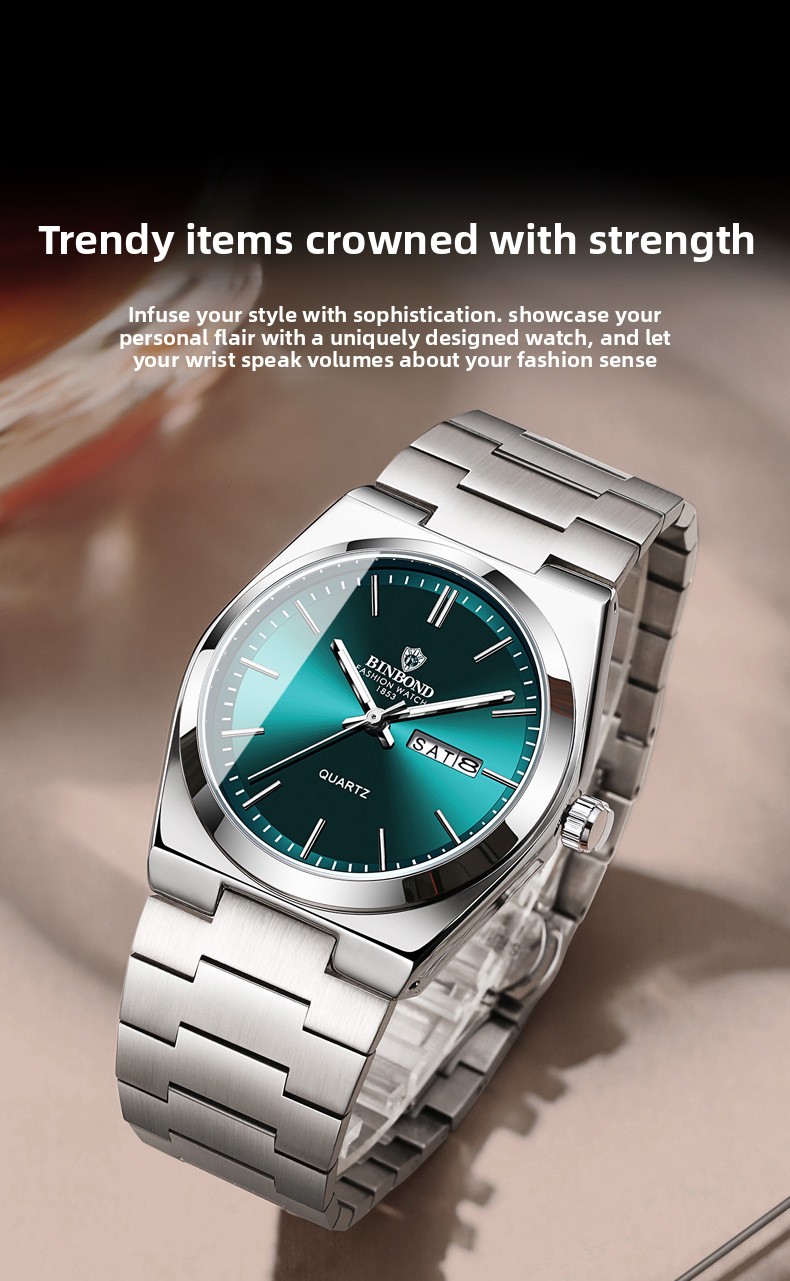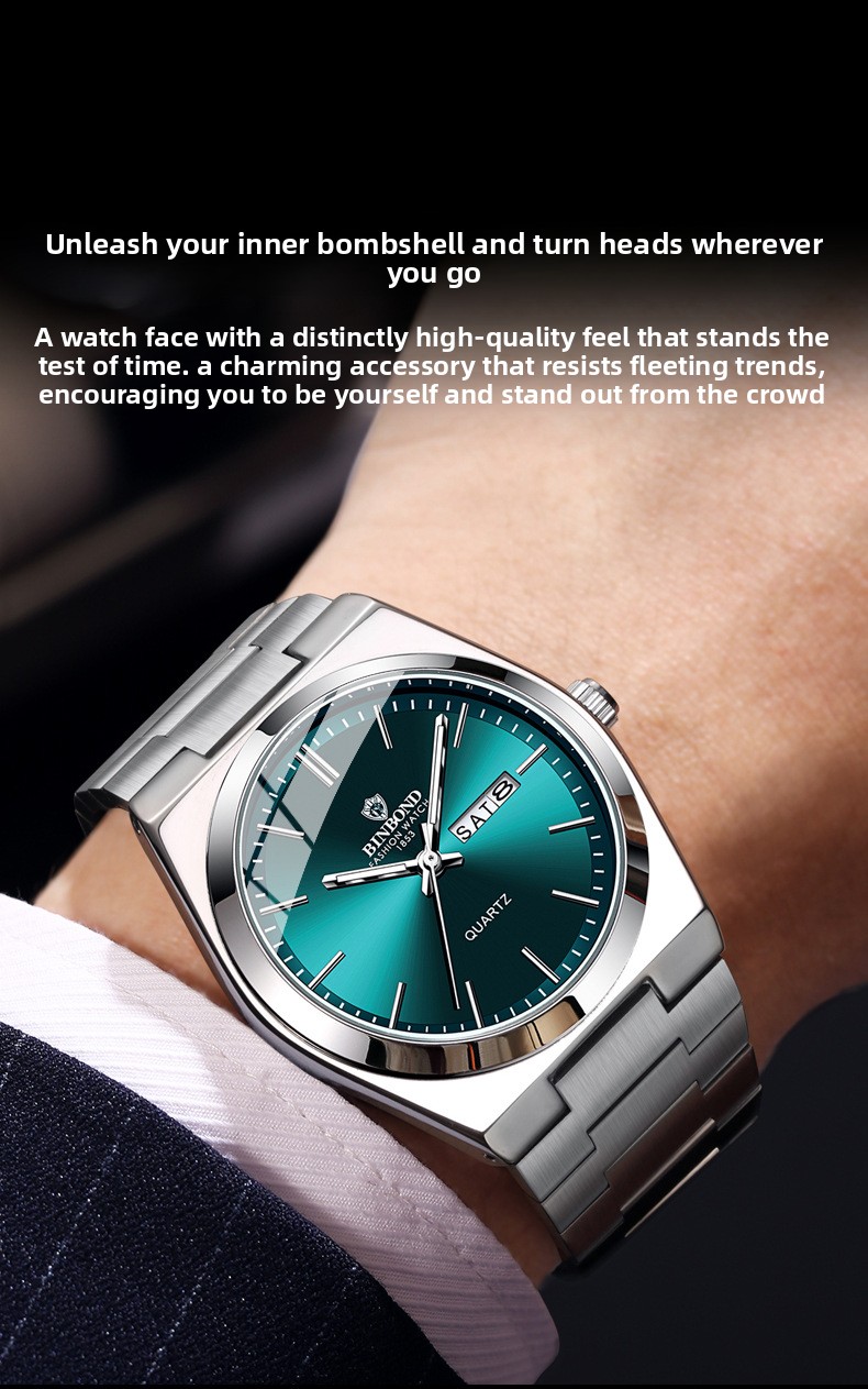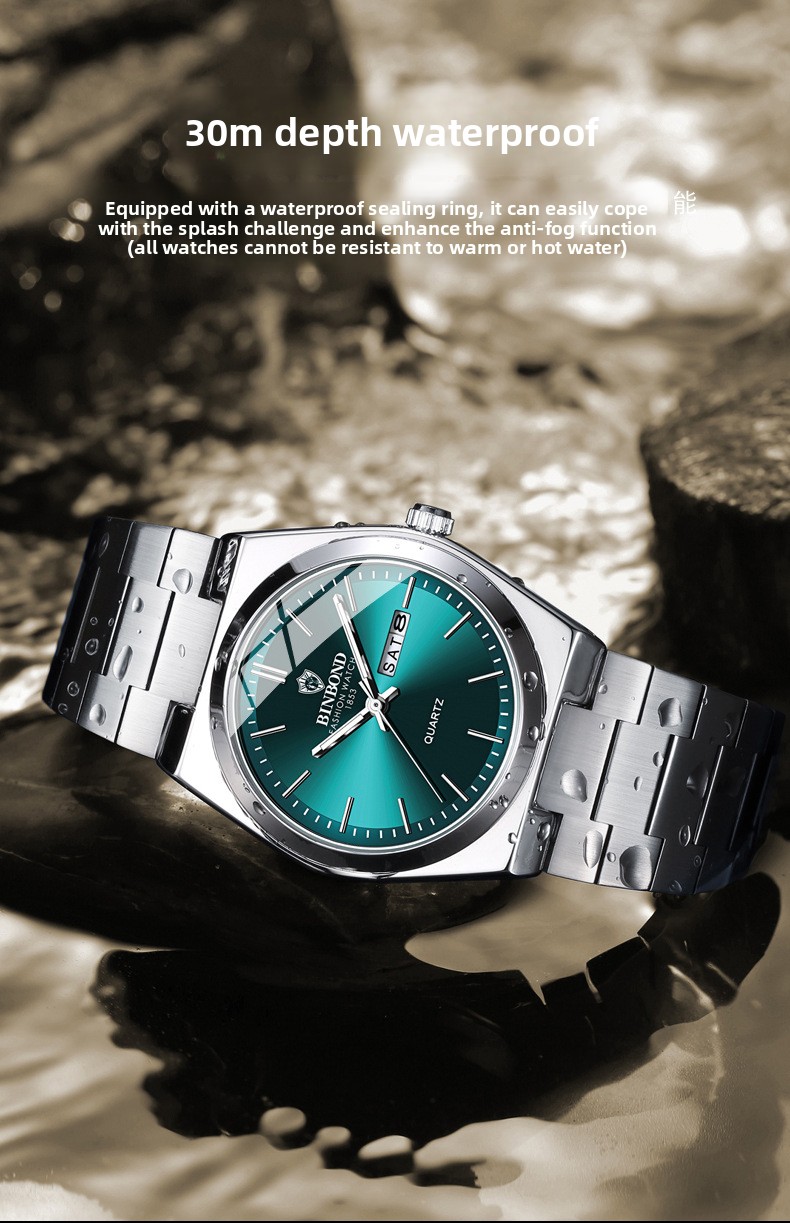 Binbang Stainless Steel Men's Quartz Watch with Double Calendar