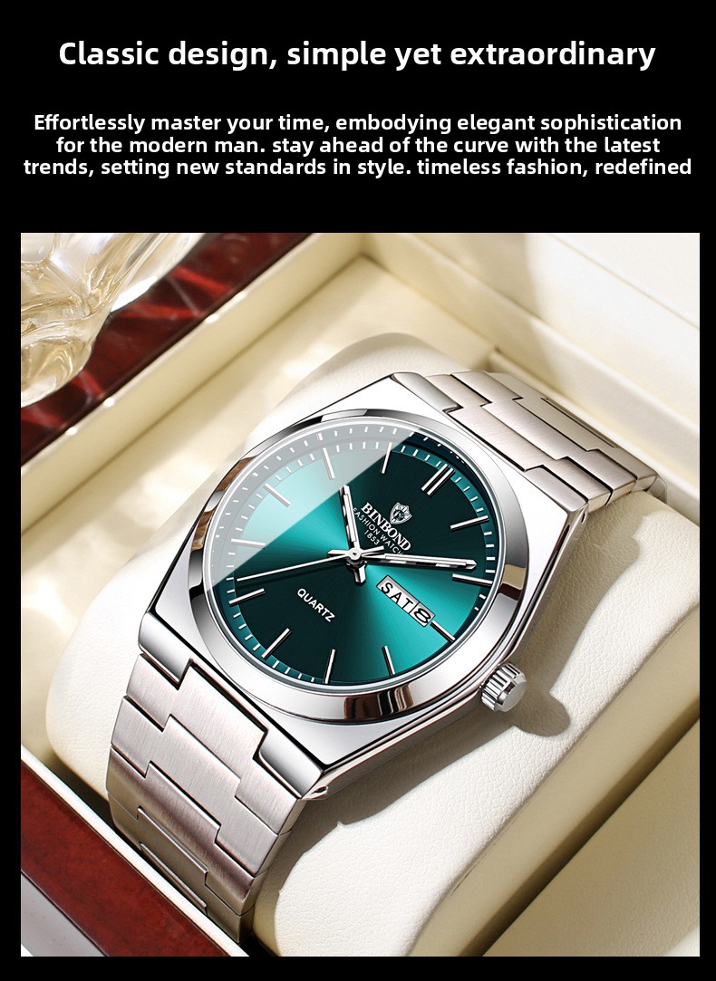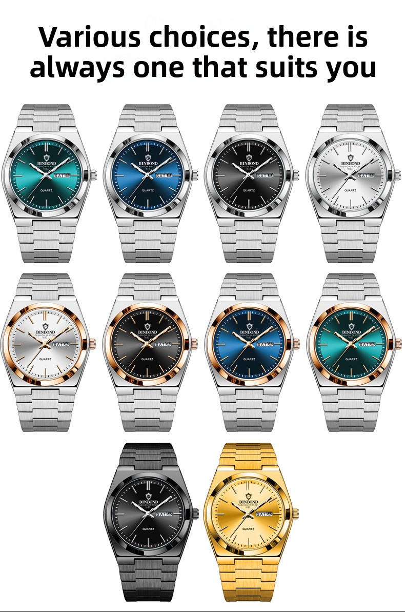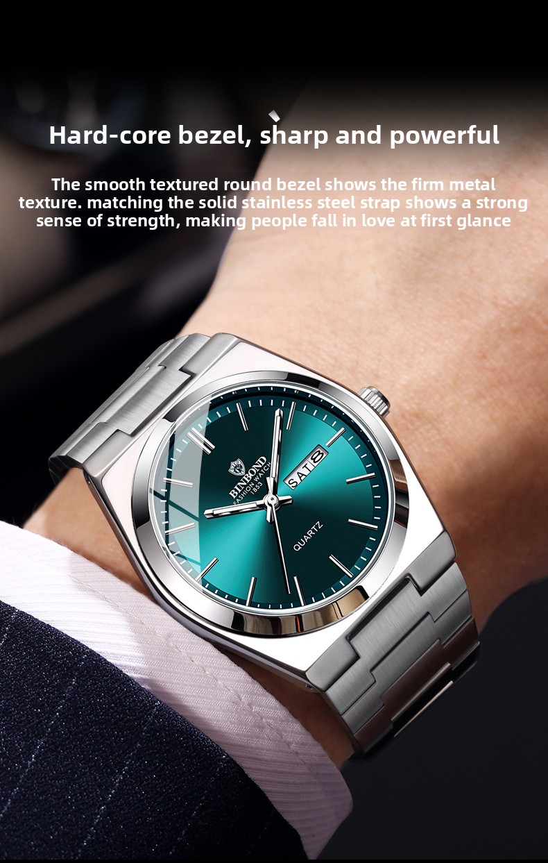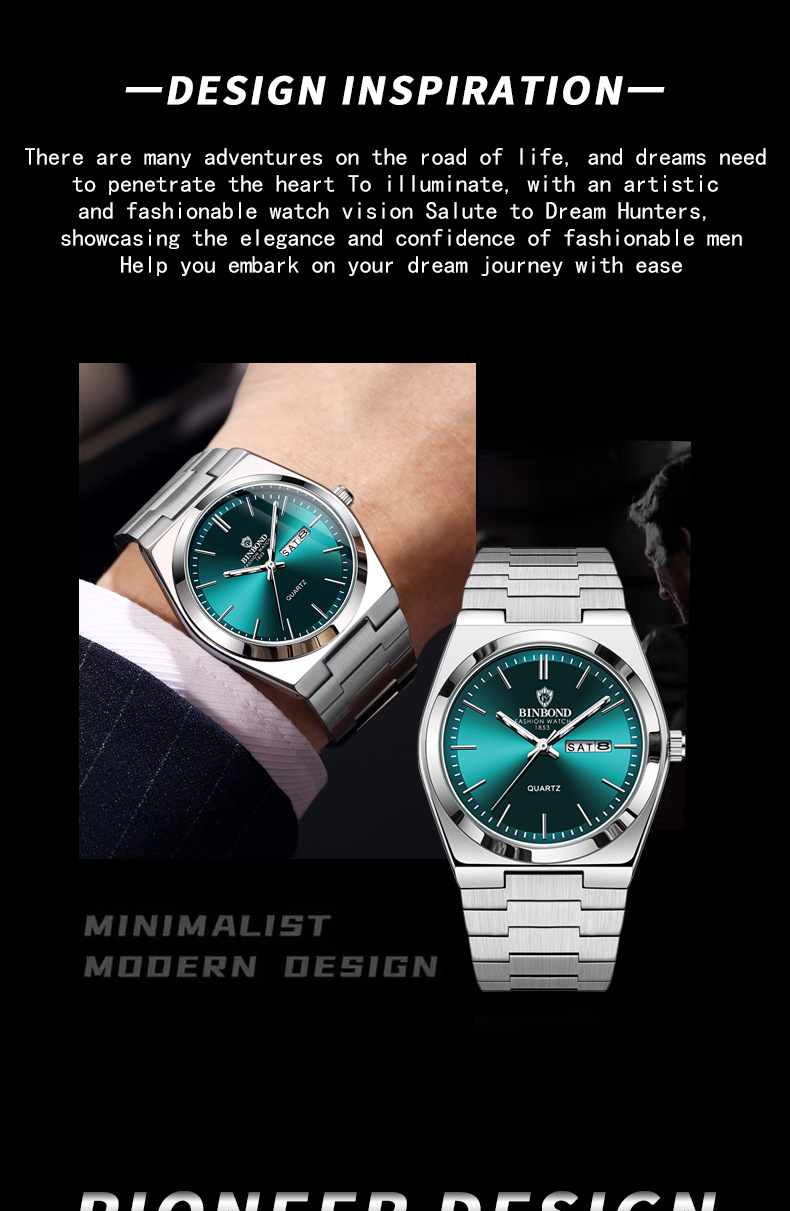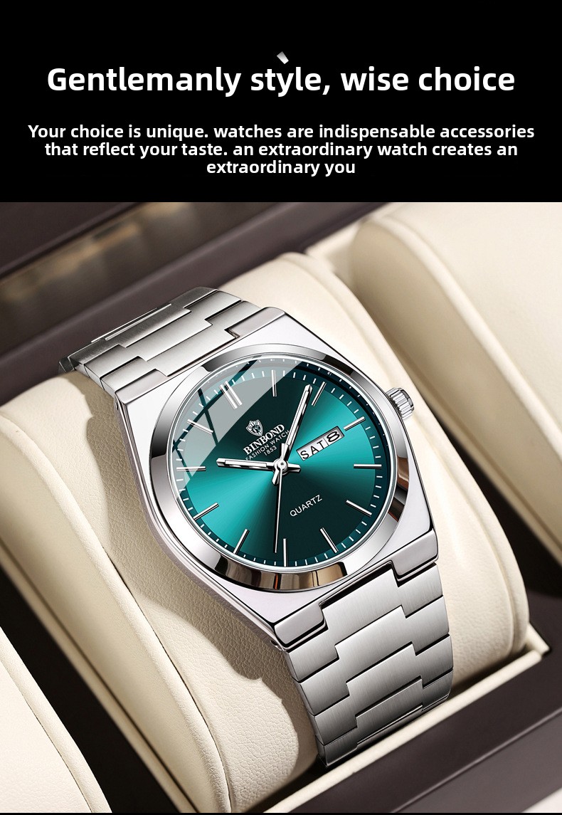 Binbang Stainless Steel Men's Quartz Watch with Double Calendar