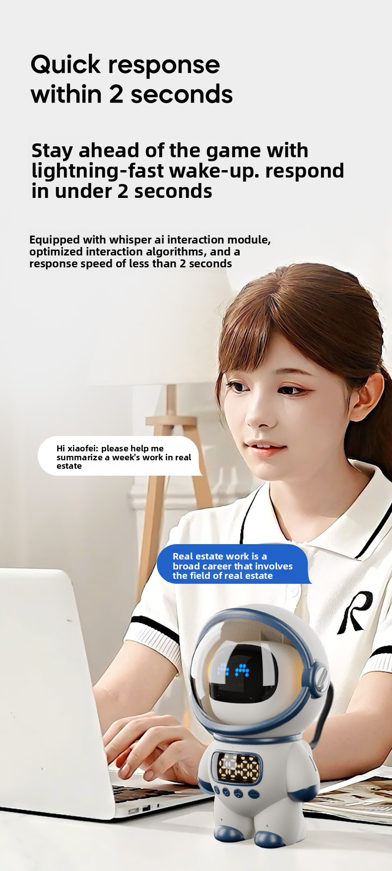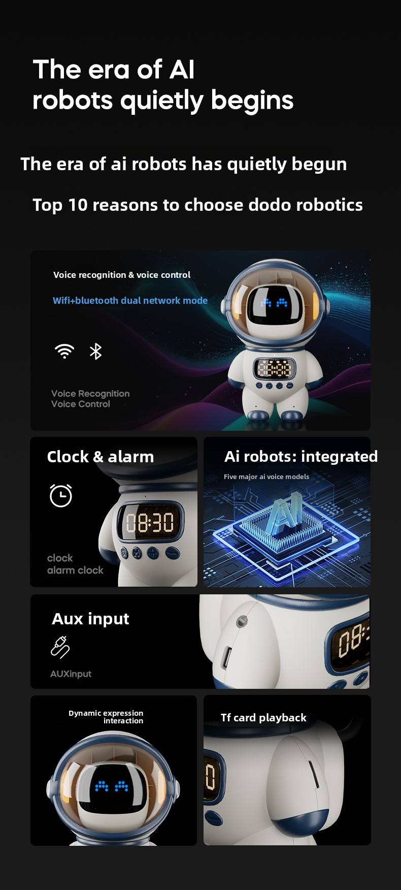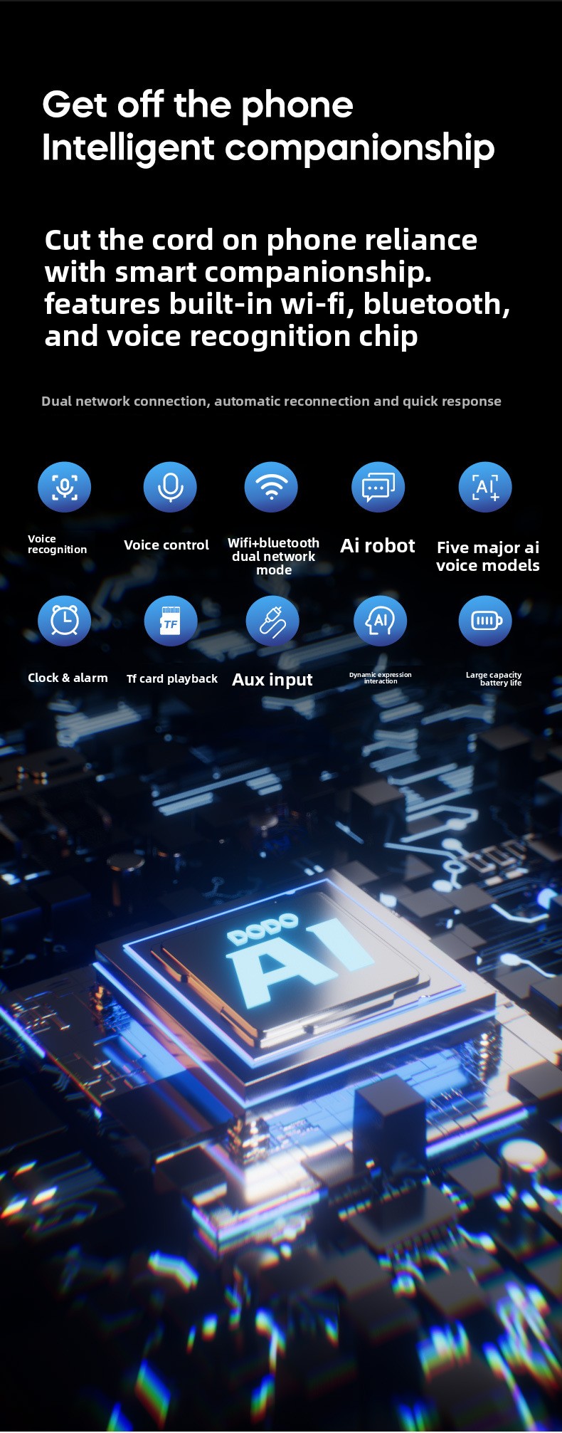Multi-functional: Supports voice control, encyclopedia queries, cloud-based alarm settings, and auto-time synchronization.