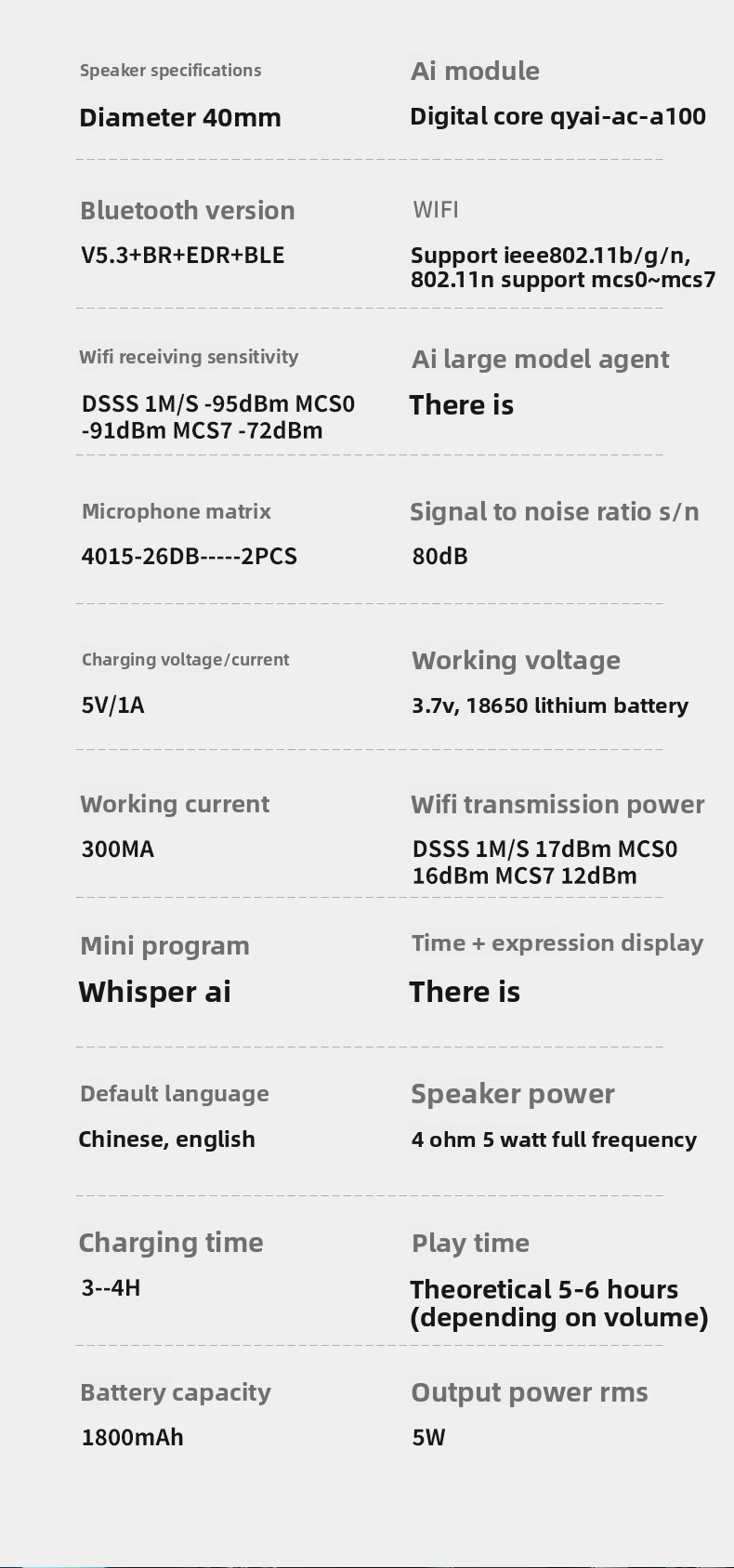 Power: 5V/1A charging, 5W output, 1800mAh built-in battery (8h playback)