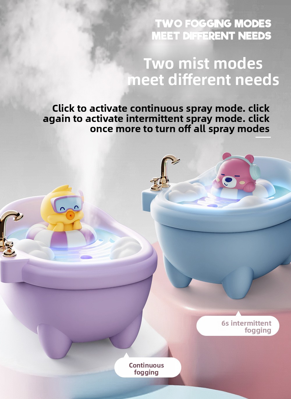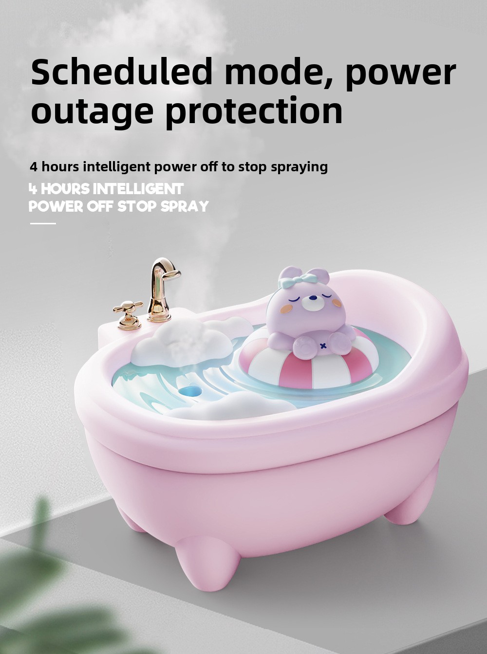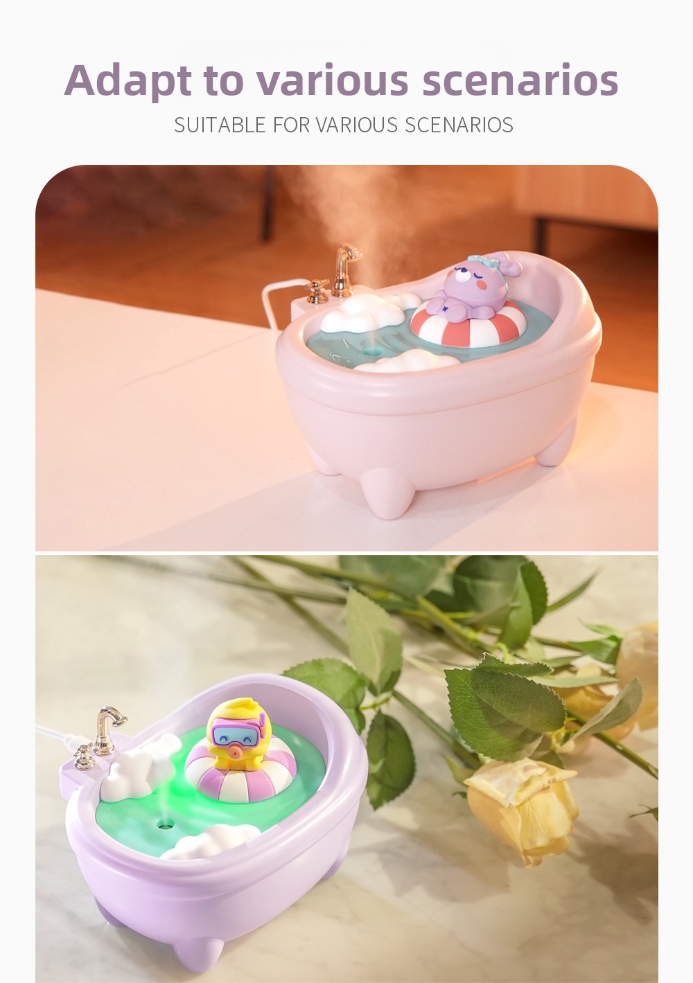 - Cute Pet Design: Adorable bathtub-shaped humidifier with cute animal figures (rabbit, duck, dinosaur, bear).