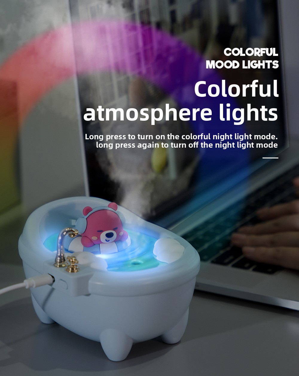 Multifunctional: Combines humidification, ambient lighting (7-color night light), and decorative toy.