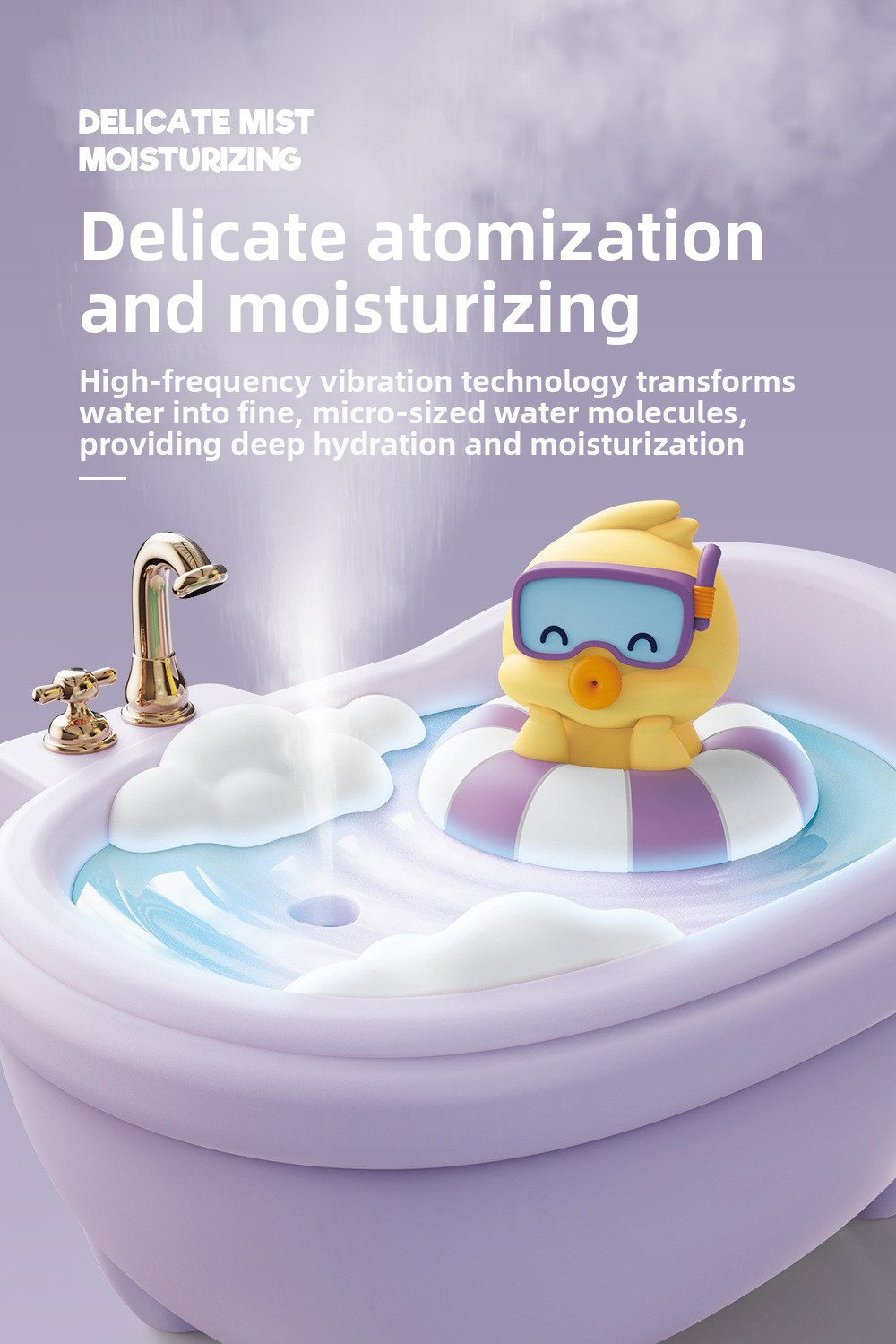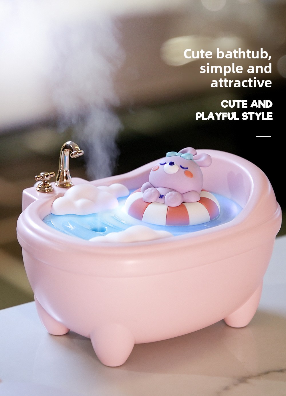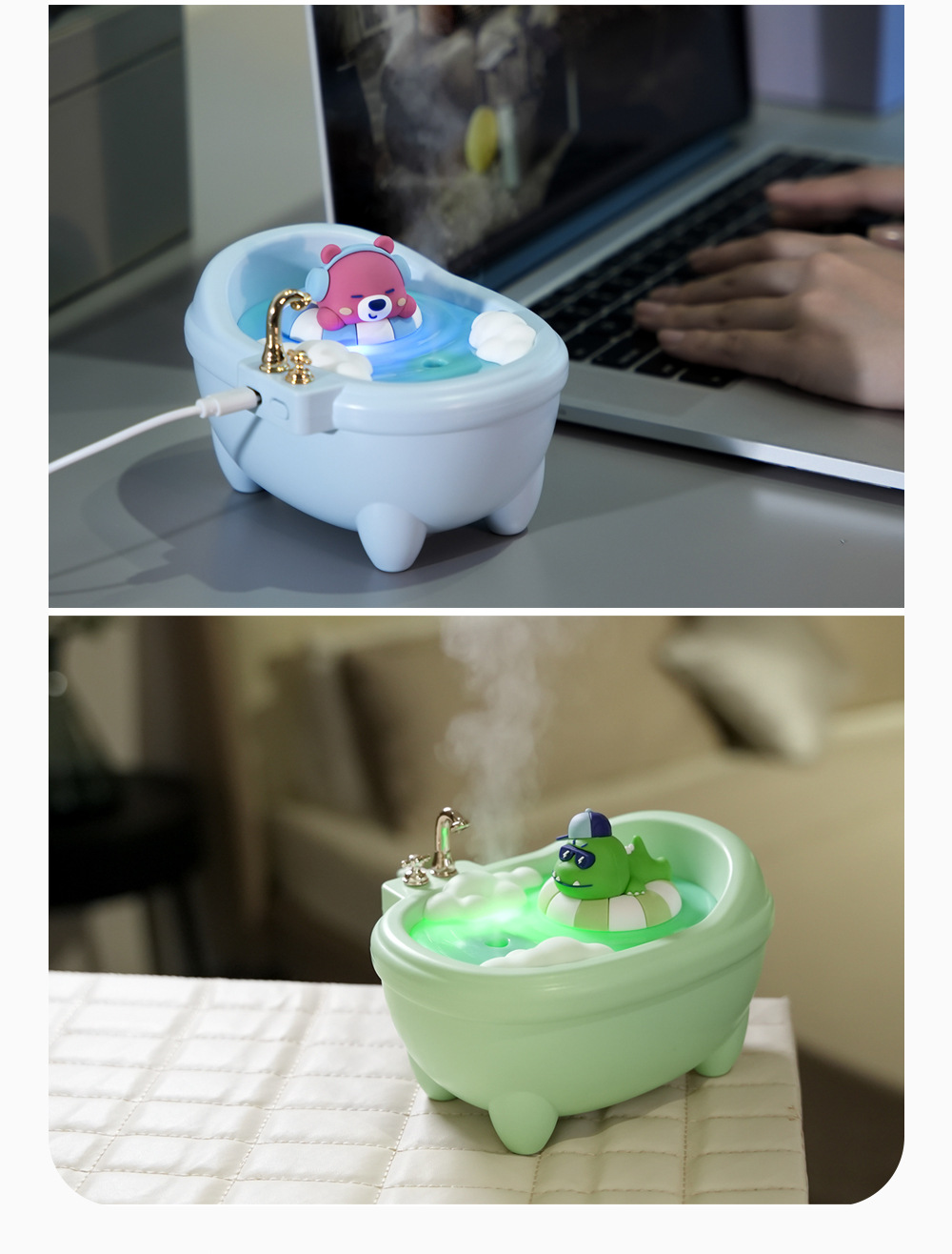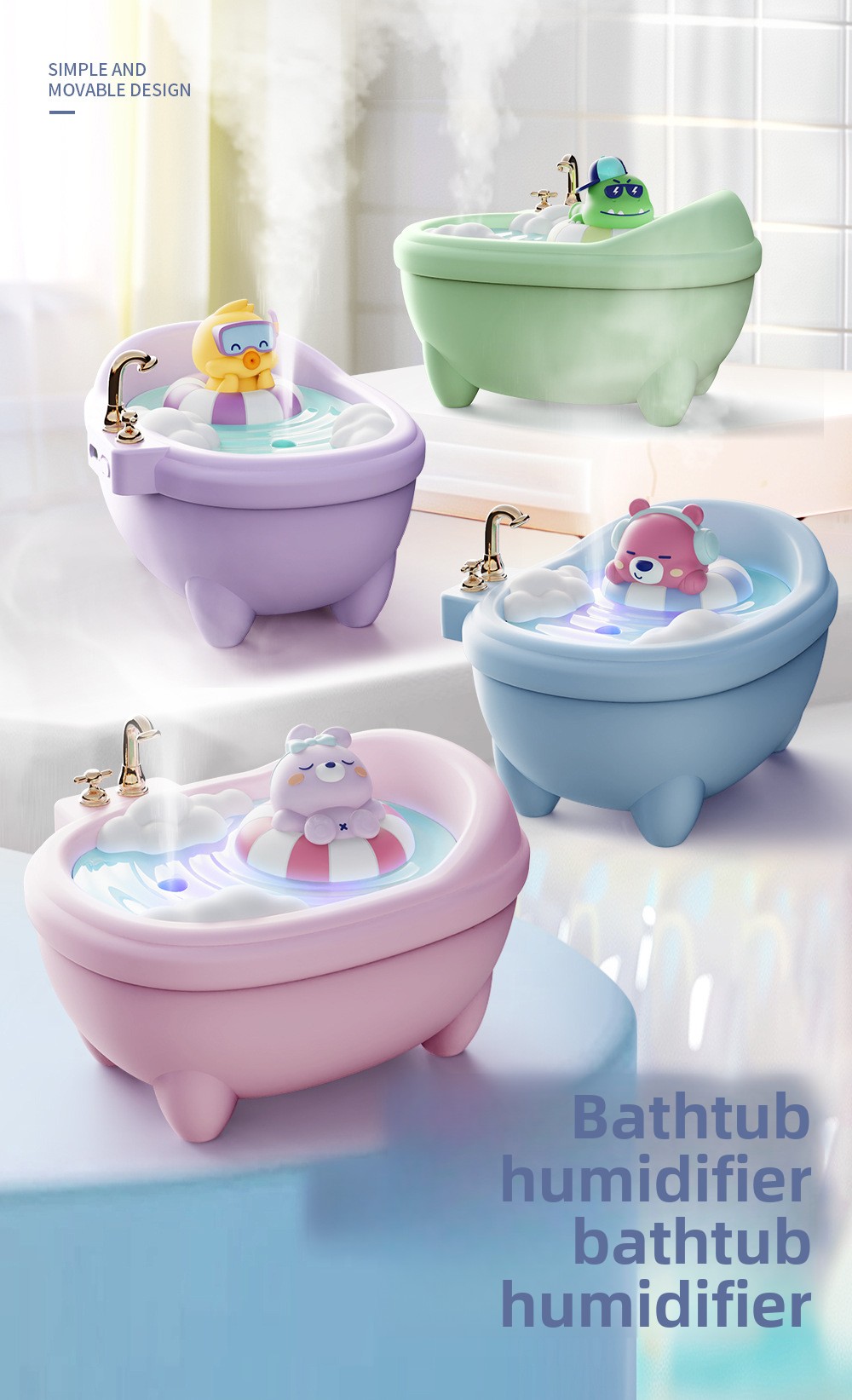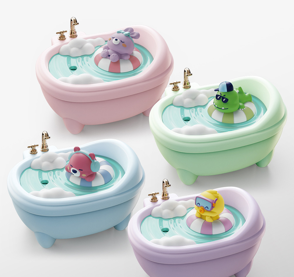 Cute Pet Design: Adorable bathtub-shaped humidifier with cute animal figures (rabbit, duck, dinosaur, bear).
