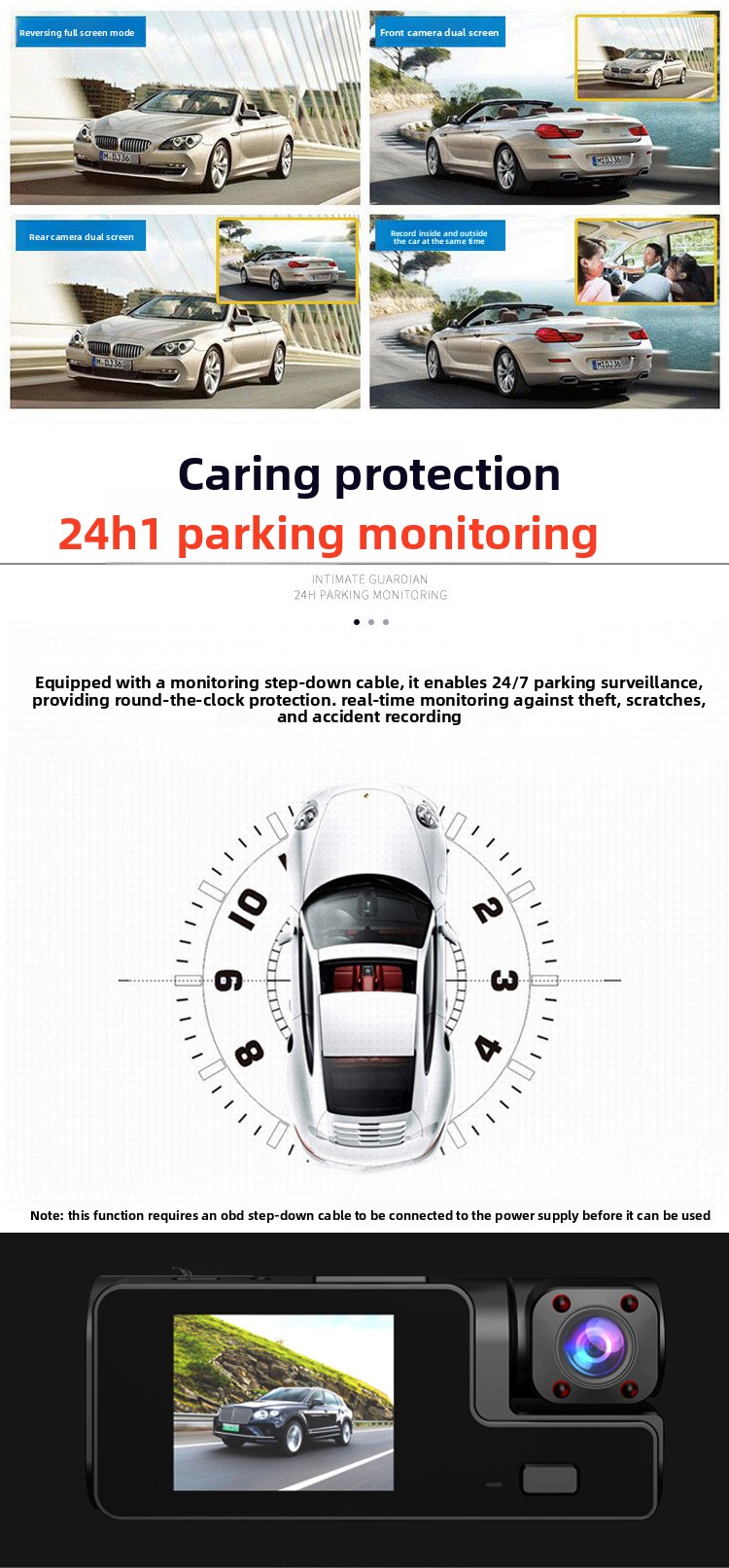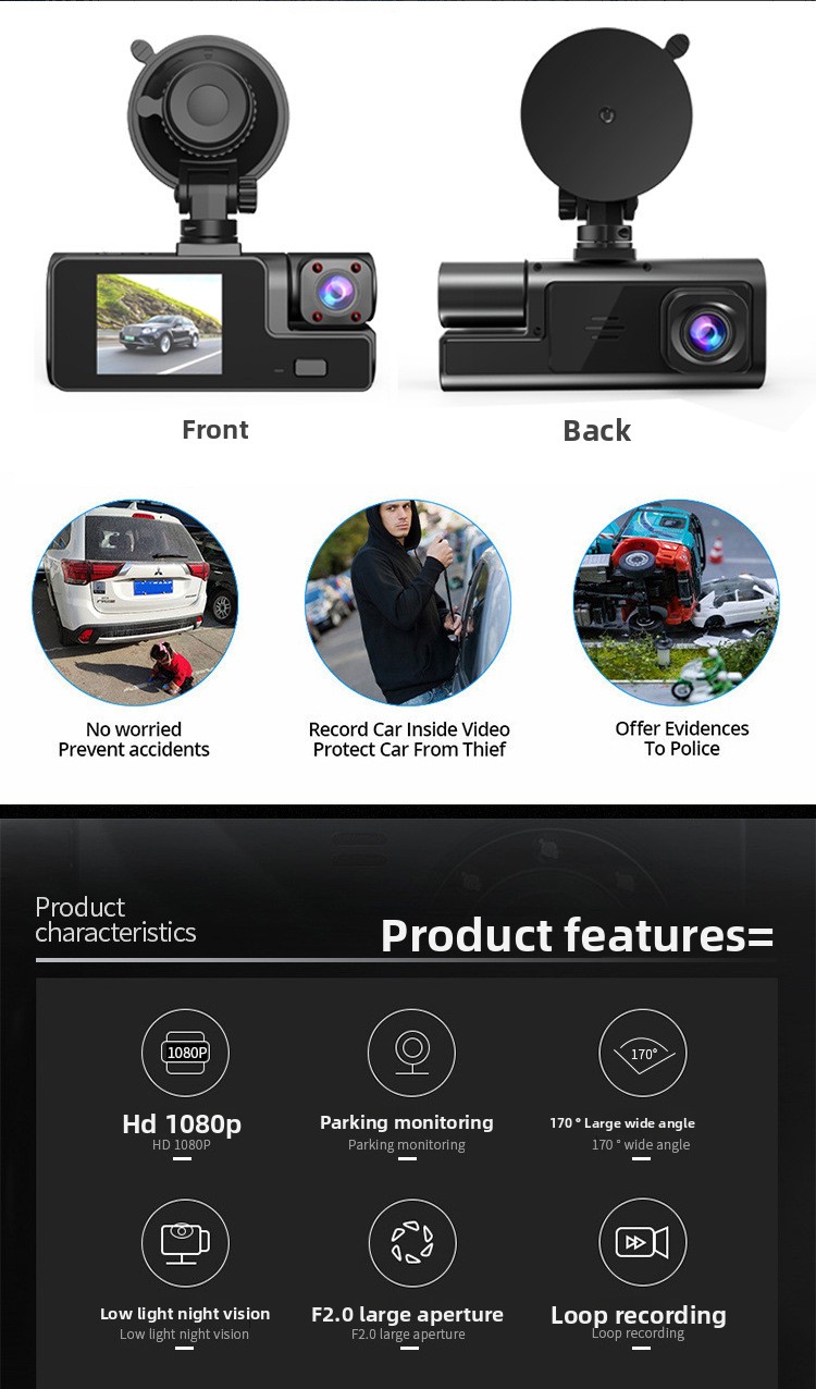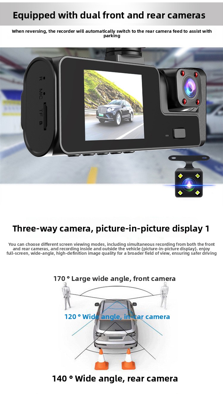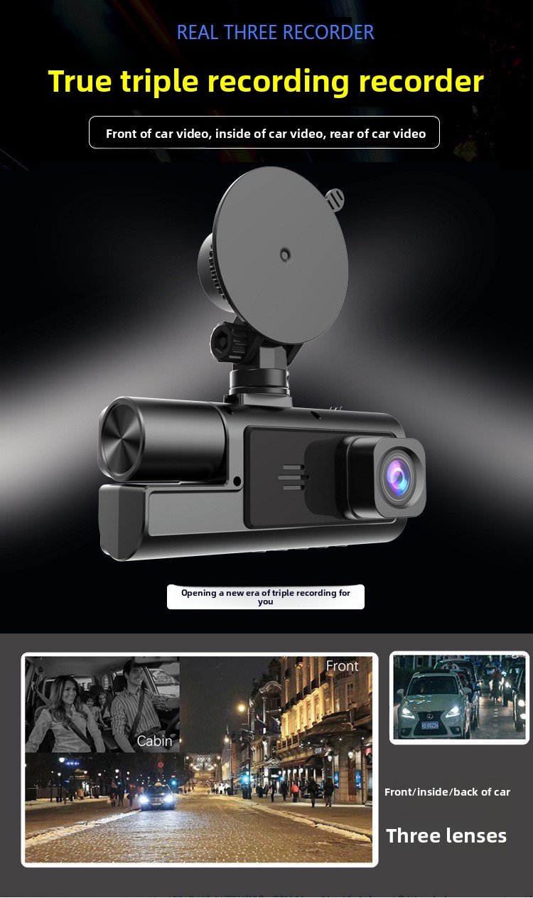 Triple Recording: Captures front, interior, and rear views simultaneously for comprehensive coverage.