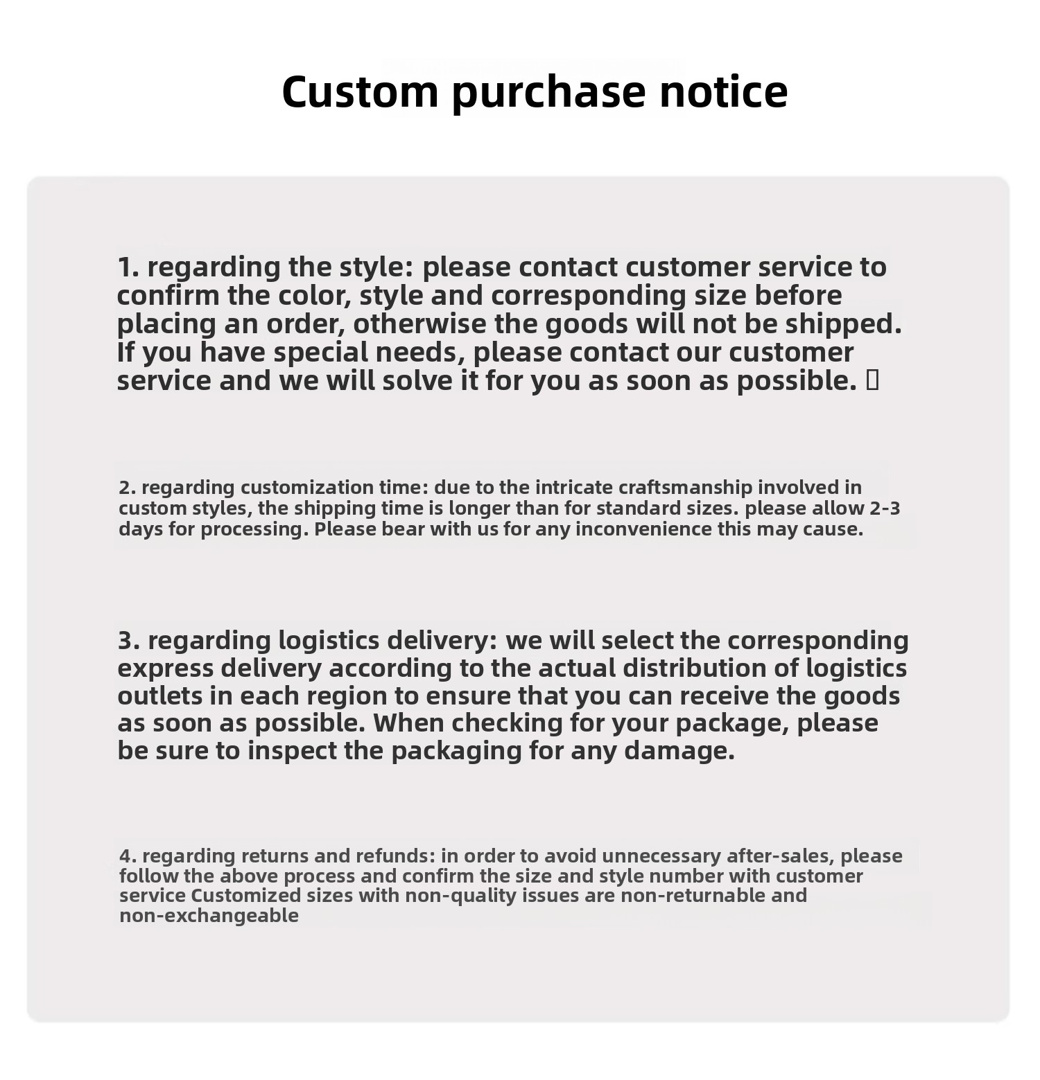 We are committed to ensuring a positive shopping experience for all our customers. If for any reason you wish to return an item, we invite you to reach out to our team for assistance, and we will evaluate every return request with care and consideration.