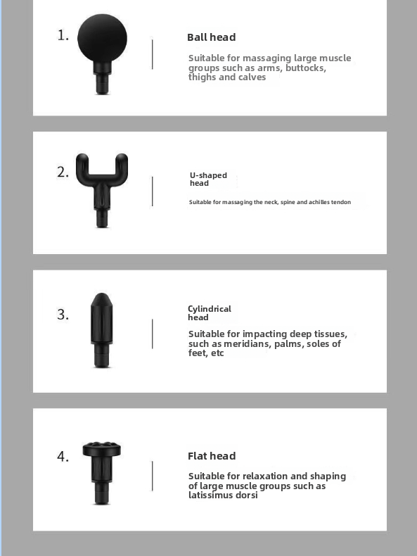 4 Massage Heads: Versatile attachments for different muscle groups and therapy types.