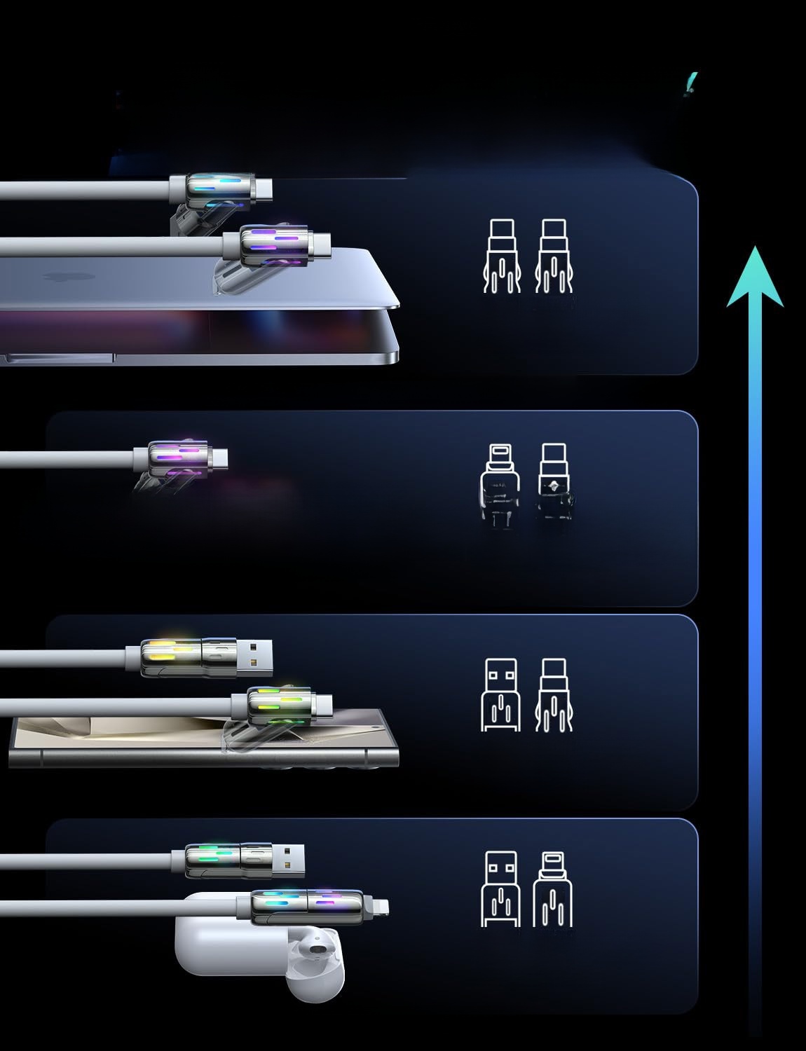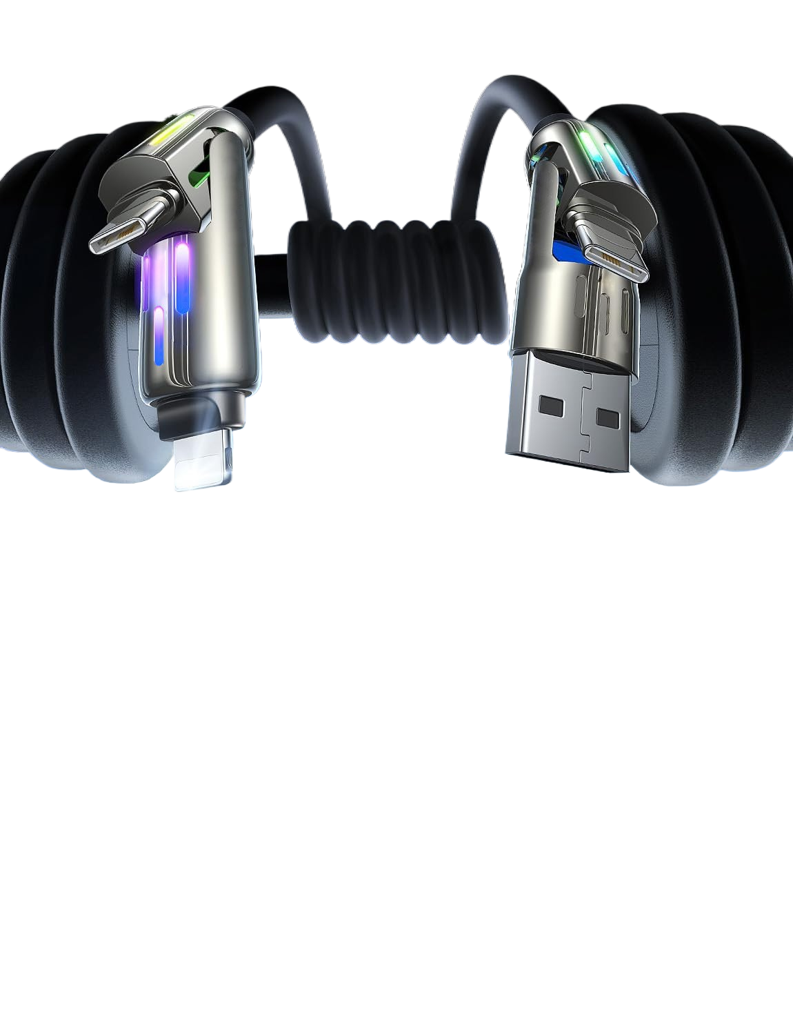 Four-in-One Design: Combines Lightning, Type-C, and other connectors for versatile compatibility (Apple, Huawei, Android, etc.).