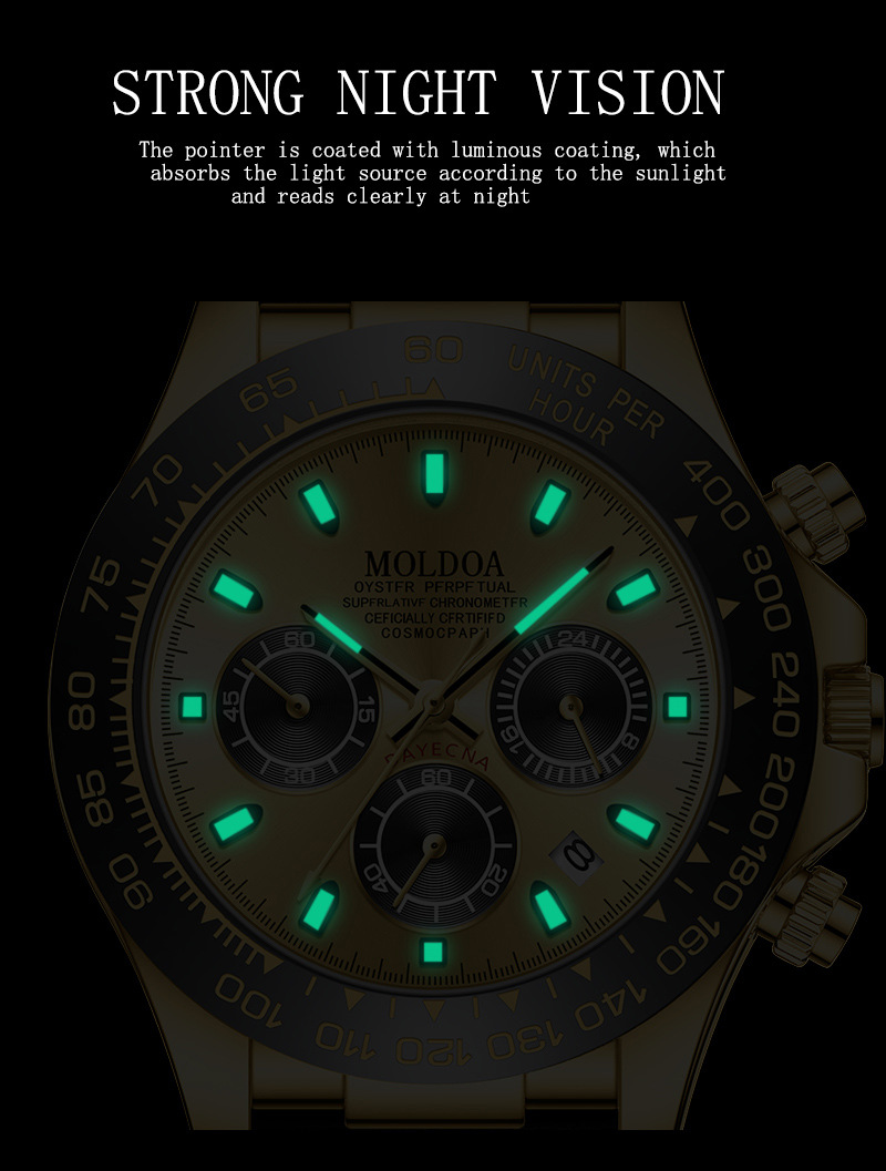 Luminous Feature: Enhanced visibility in low-light conditions with luminous hands