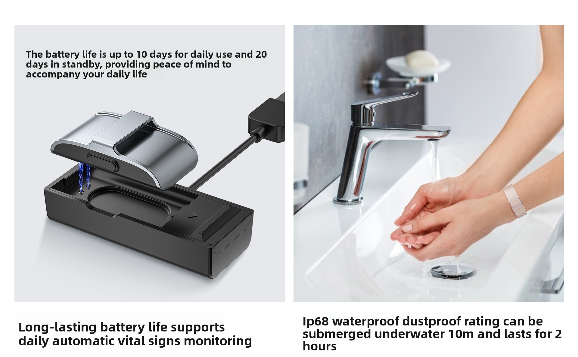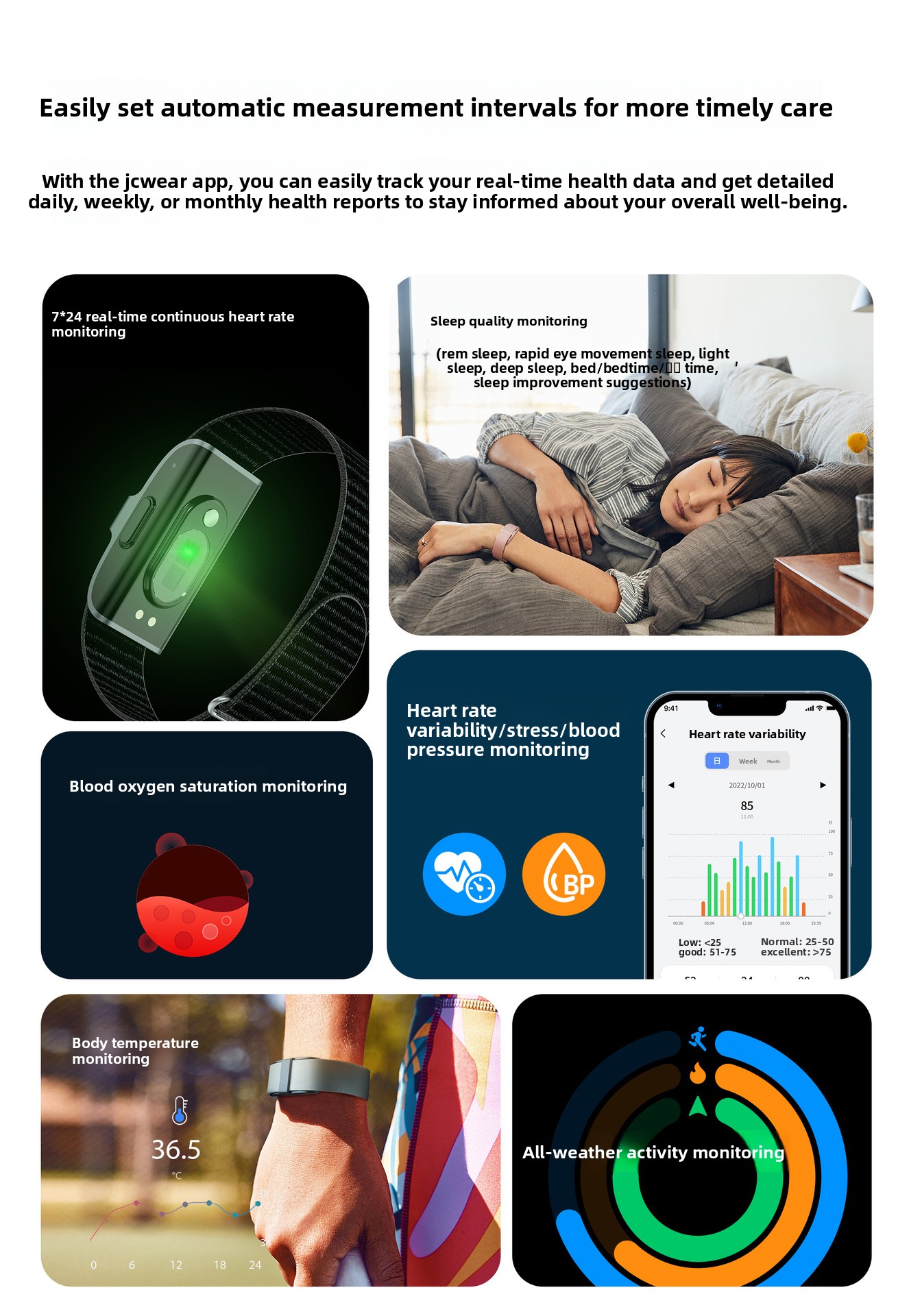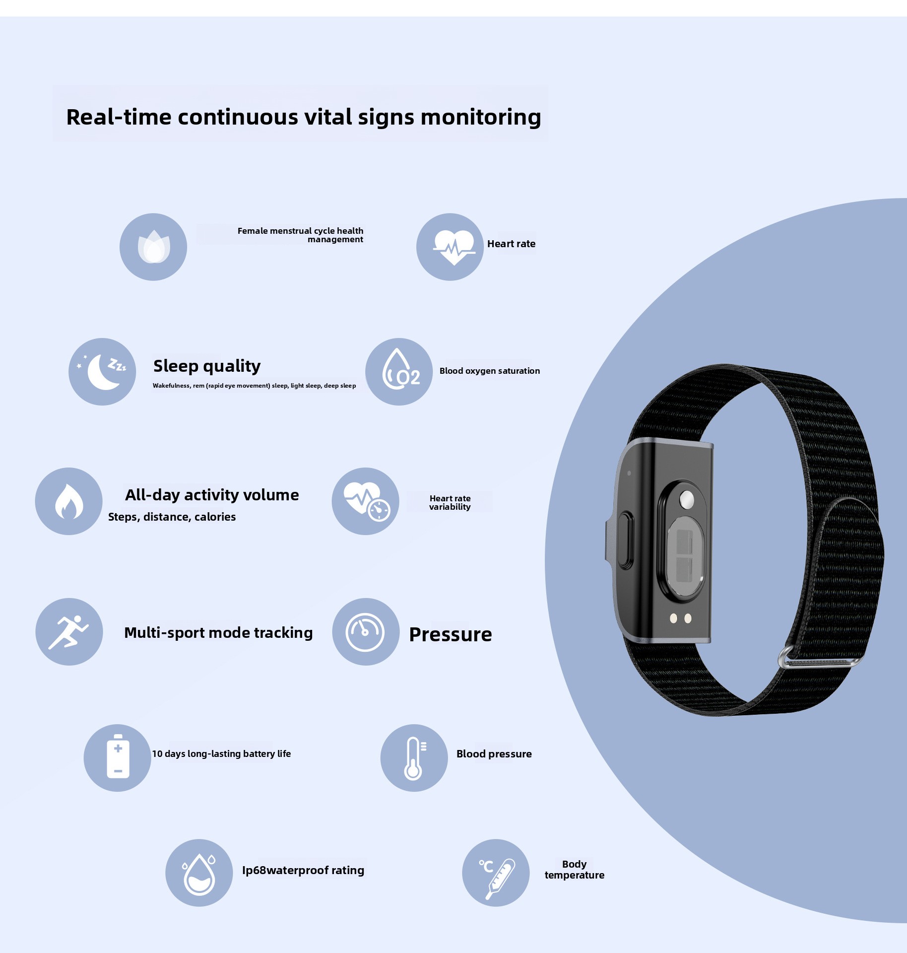 Real-time Monitoring: Tracks heart rate, body temperature, blood pressure, and blood oxygen levels for comprehensive health insights.