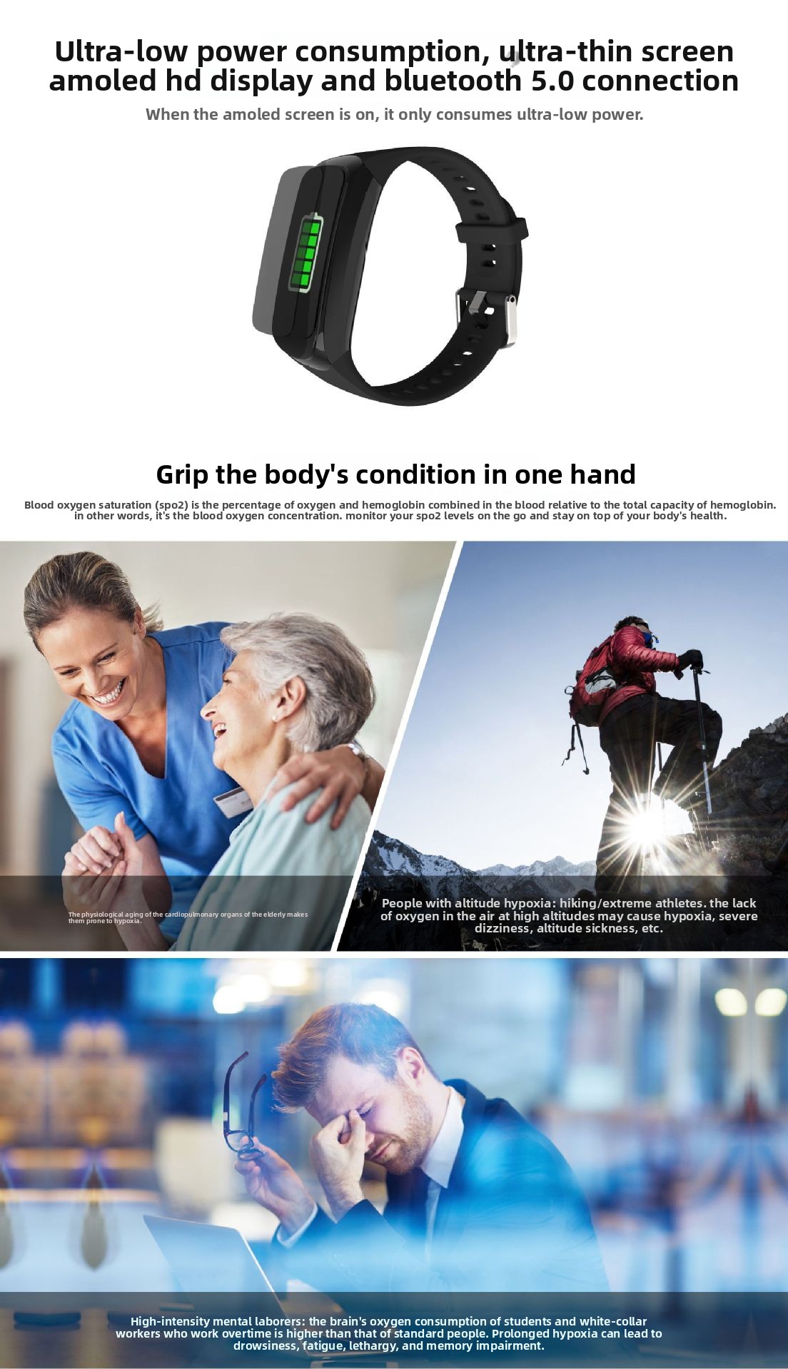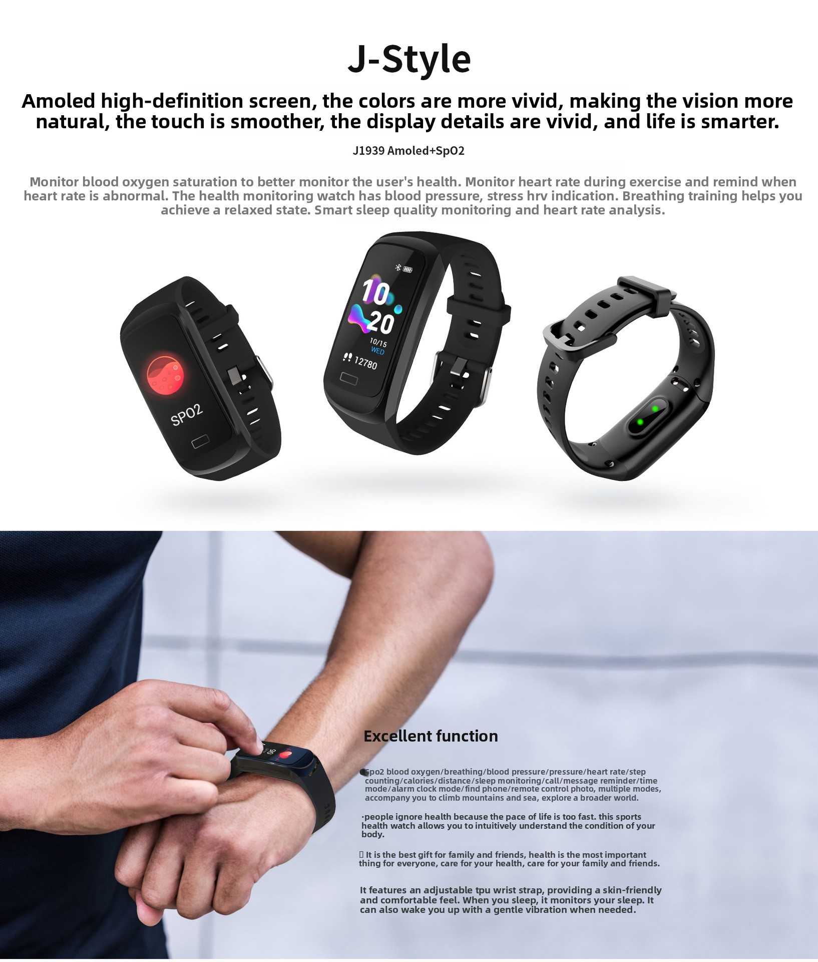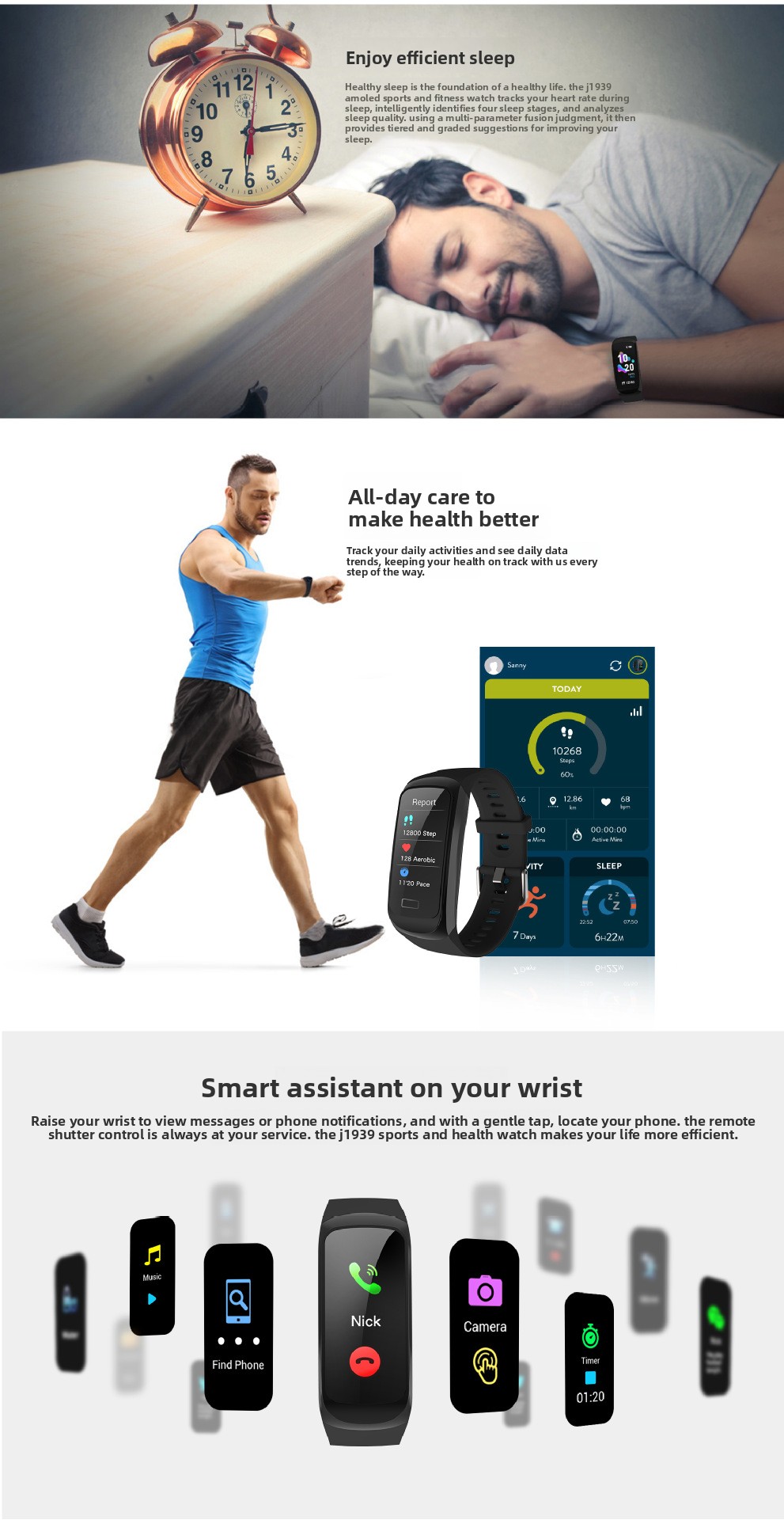 Multi-Functionality: Includes step counting, blood pressure measurement, sleep monitoring, blood oxygen detection, and smart reminders.