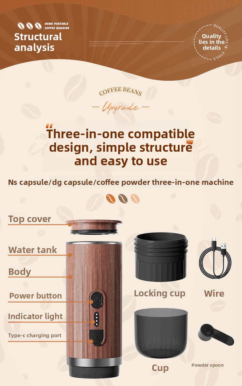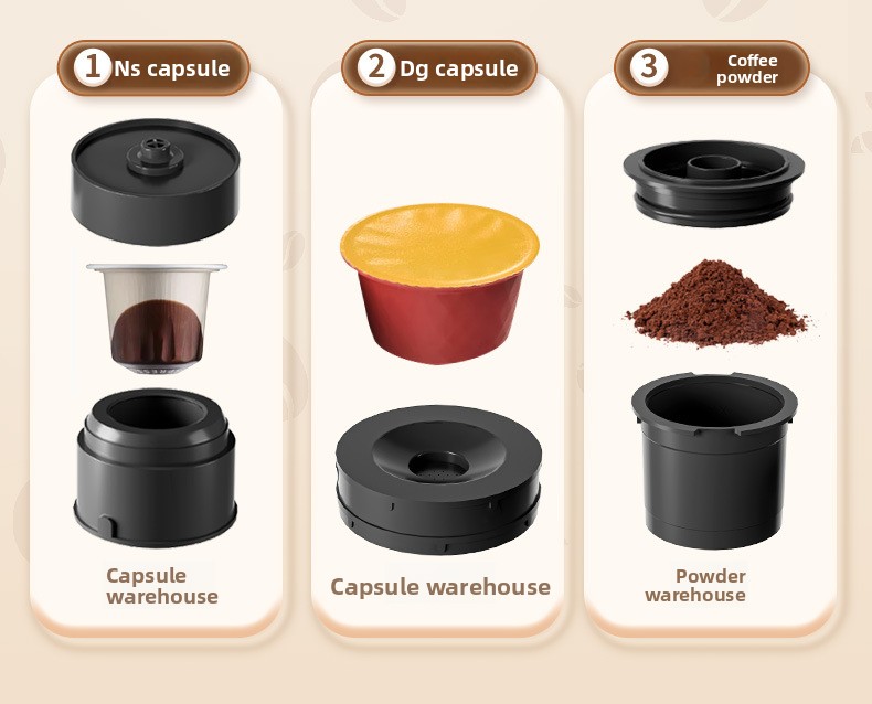 Versatile Brewing: Compatible with coffee capsules and powder, offering a 3-in-1 brewing solution.